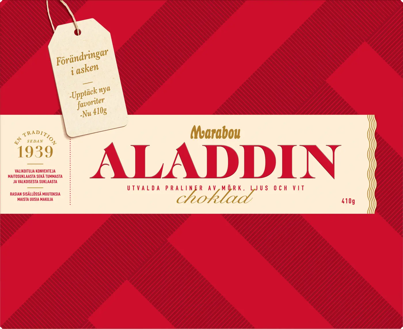 Marabou Aladdin är Sveriges mest köpta pralinask från 1939! Asken är fylld av våra ikoniska och fantastiskt goda chokladpraliner med många härliga fyllningar. Aladdin är den perfekta gå-bort-presenten, ett måste till julen eller om du önskar unna dig en riktigt god pralinask. Genom Cocoa Life, vårt program för en hållbar kakaoproduktion, bidrar Marabou till att kakao odlas på rätt sätt, för att skydda planeten och respektera mänskliga rättigheter i vår värdekedja. Läs mer om Cocoa Life här www.cocoalife.org.