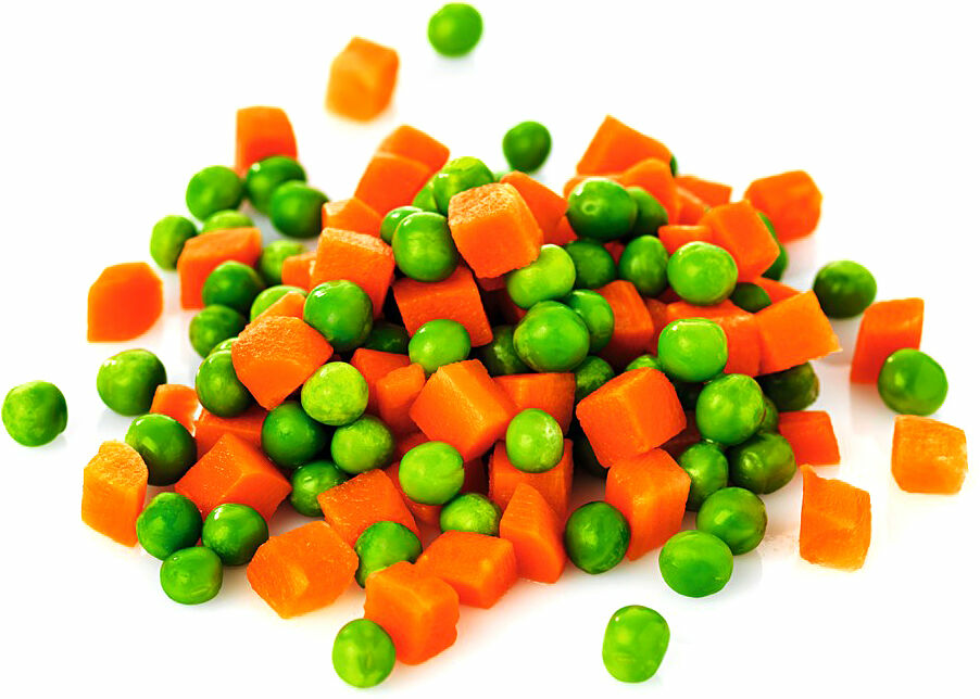 Ärter* och tärnade morötter. Grönsakerna är förvällda. *Klimatcertifierad Svenskt Sigill-råvara.