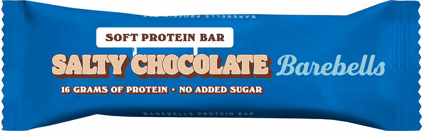 Mjuk proteinbar med chokladöverdrag. Smak av Salt Choklad. Innehåller sötningsmedel. Utan palmolja.
