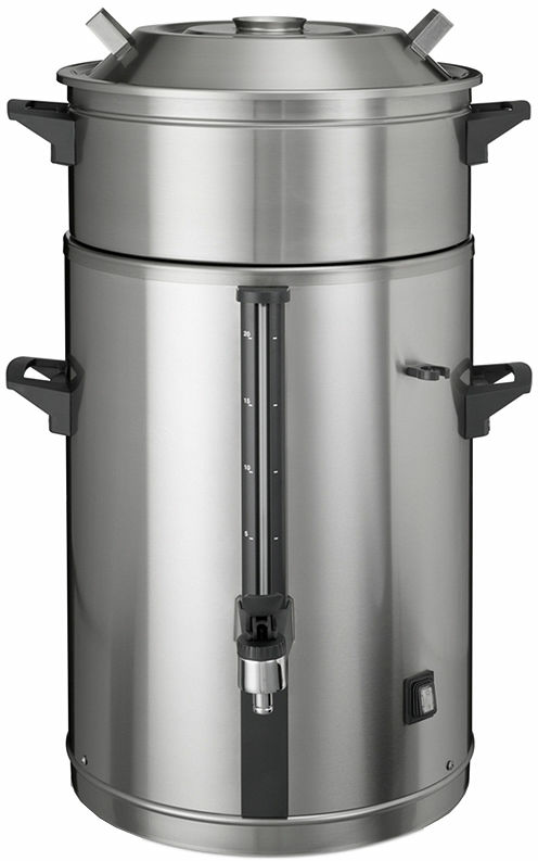 Eluppvärmd dubbelmantlad behållare (VHG) med filterhållare, blandarrör, non-drip tappkran, nivåglas, inner- och ytter lock.