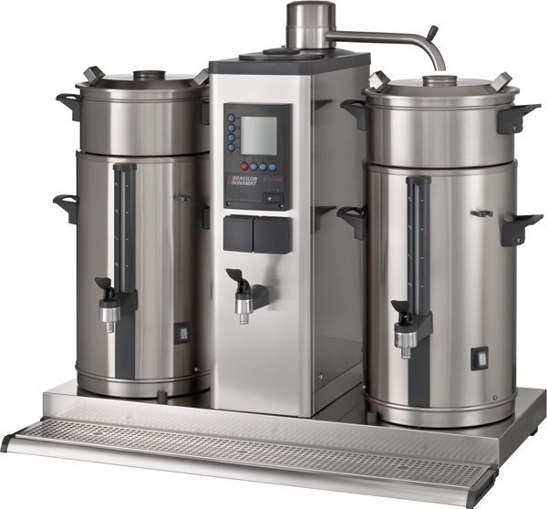 Bryggare för korgfilter med separat hetvattenkran och för utrymmen med vattenanslutning. Brygger stora mängder kaffe i separata behållare. Utrustad med digital display, total- och dagräknare, avkalkningssystem, signal när kaffet är klart, inbyggd timer och hög säkerhet. Levereras med behållare av VHG-typ, bryggenhet(er) och spillbricka.
