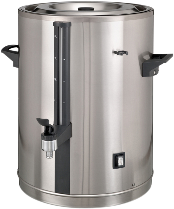 Eluppvärmd, dubbelmantlad behållare med nivåglas, non-drip tappkran, inner- och ytter lock.