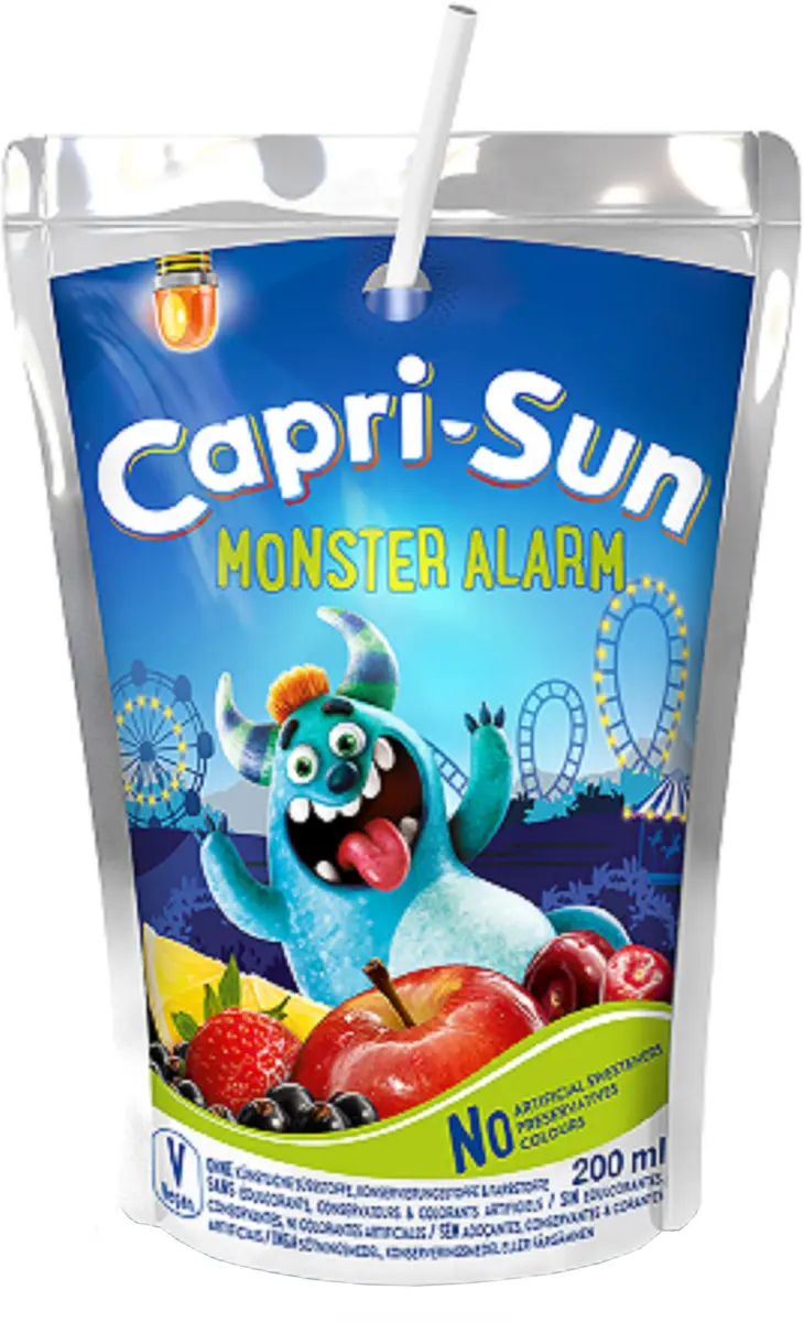 Capri-Sun Monster Alarm fruktig mix med smak av äpplen, svarta vinbär och syrliga körsbär.