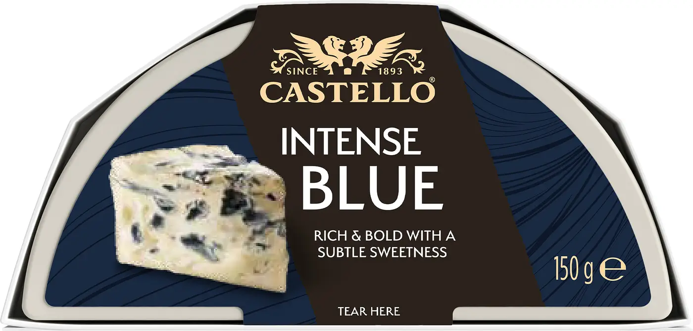 Letar du efter en god dessertost till din ostbricka? Castello® Intense Blue är en smakrik ädelost, även kallad blue cheese eller blåmögelost, gjord på en blandning av ko- och fårmjölk. Blåmögelosten har en frisk doft av blåmögel och inslag av svampskog. Osten har en blåmögelmarmorerad gräddvit snittyta och konsistensen är krämigt len. Smaken är kraftig och aromatisk med tydlig sälta, blåmögel och behaglig syrlighet. Den långa, kraftfulla eftersmaken är präglad av nötighet och skogsmark. Castello Intense Blue passar på ostbrickan och smakar särskilt gott till stenugnsbakat bröd, söta marmelader & chutneys, fikon och fylligt och smakrikt rött vin.