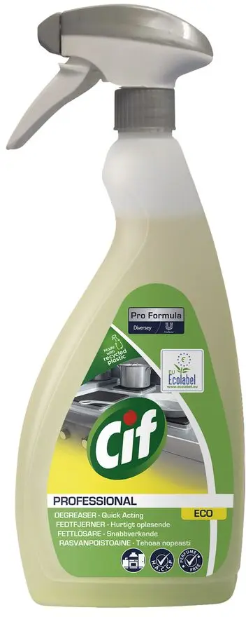 Cif Professional Eco Degreaser löser snabbt upp fett och envis smuts och lämnar en skinande ren yta efter sig. Bruksfärdig parfymfri produkt i en triggerspray för enkel användning och för att motverka livsmedelsföroreningar. Lämplig för de flesta köksytor, t.ex. beredningsutrymmen, köksredskap, kastruller, stekpannor, spisar, huvar, filter, golv, väggar, dörrar och avlopp. Miljömärkt.