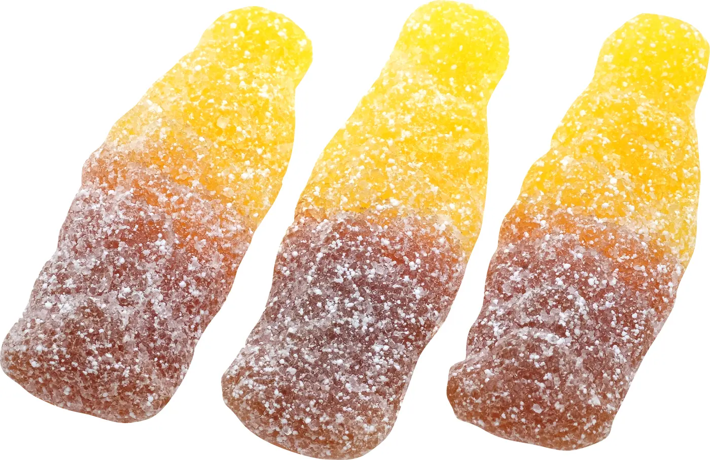 socker/sukker, glukossirap, stärkelse/stivelse, vatten/vand, syror (citronsyra, äppel-/æble-/eplesyre), surhetsreglerande medel (natriummalater, natriumcitrater), naturliga aromer, karamelliserat socker/sukker, färgämnen/farvestoffer (kurkumin, paprikaekstrakt).
