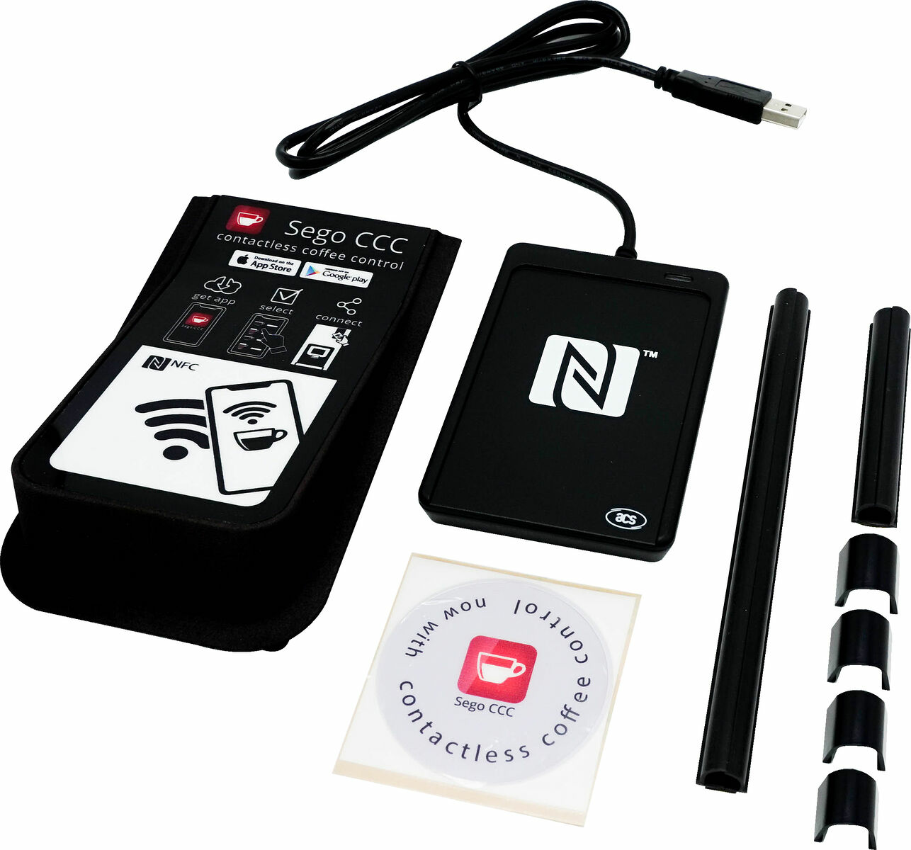 Du behöver det beröringsfria kontrollkittet för att kunna ansluta din mobiltelefon till espressomaskinen Sego. Detta kit innehåller en ny behållare, kabel, etikett och en NFC-läsare som kommunicerar med de flesta smartphones. Minimikraven för appen Contactless Coffee Control är Android-version 6.0 och iOS-version 13.
