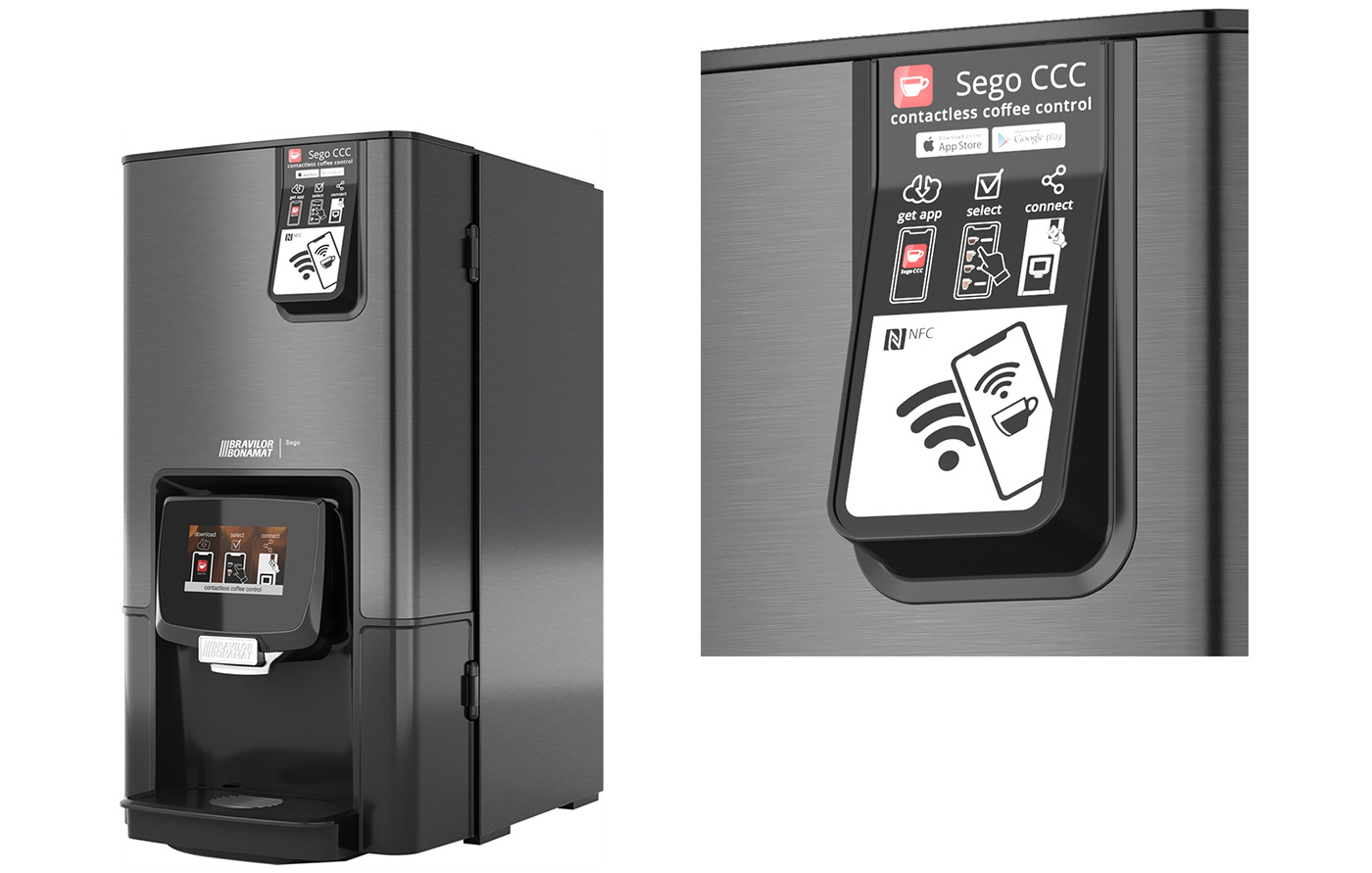Appen kommunicerar med en NFC-läsare i Sego. Ladda ner Sego CCC appen, håll din smartphone nära NFC-modulen så ser du dryckerna på din smartphone. Placera din kopp under utloppet, välj och tryck på start.