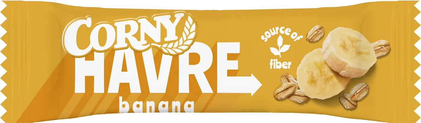 Corny Havre Banana är en mjuk havrebar med härlig banansmak. Packad med fullkornsflingor av havre som både mättar bra och smakar toppen. Corny Havre Banana muslibar är ett perfekt snack eller mellanmål när du är ”on the go”. En smakrik mjukseg bar med över 50 % fullkornsflingor av havre. Den är inte bara en källa till fibrer, den är också riktigt god. Gillar du banan kommer du att gå bananas när du smakar den här!