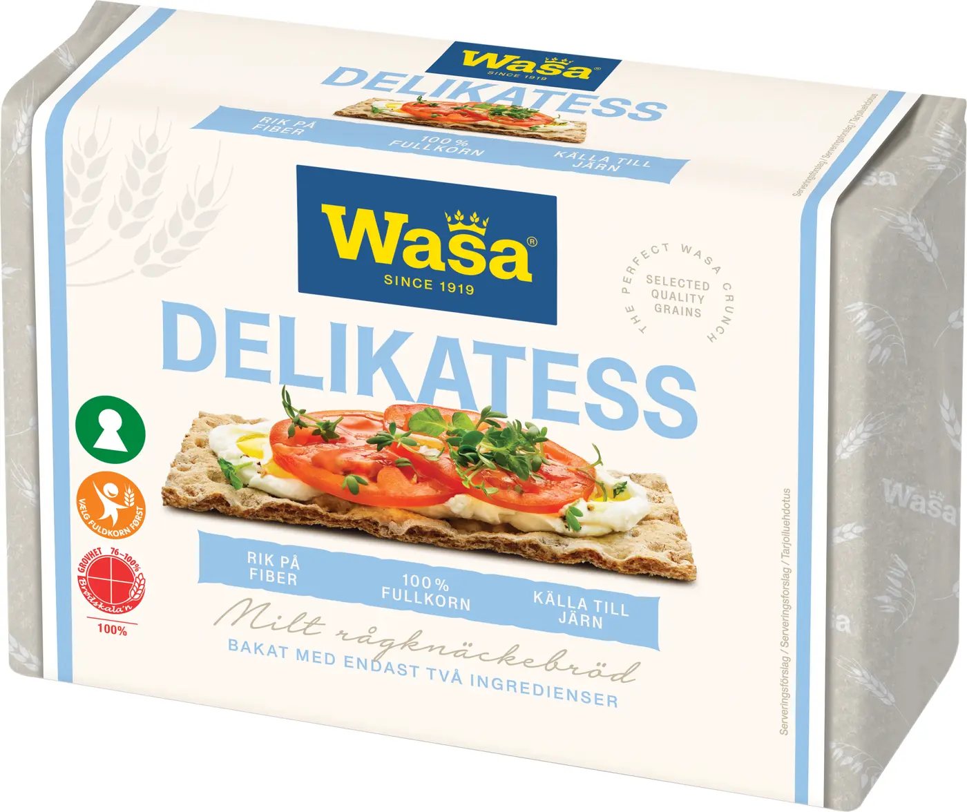 Wasa Knäckebröd Delikatess är ett riktigt tunt knäckebröd med mycket god smak. Det är ett ljust knäckebröd, nästan vitt, och en uppskattad delikatess. Vårt rågknäckebröd är sprött och krispigt med en mild smak. Det passar utmärkt med alla typer av pålägg, men kanske bäst med något från delikatessdisken. Knäcket är bakat på fullkornsrågmjöl och innehåller mycket kostfiber, järn samt 100% fullkorn. Wasa Delikatess knäckebröd är nyckelhålsmärkt och 100% klimatkompenserat.