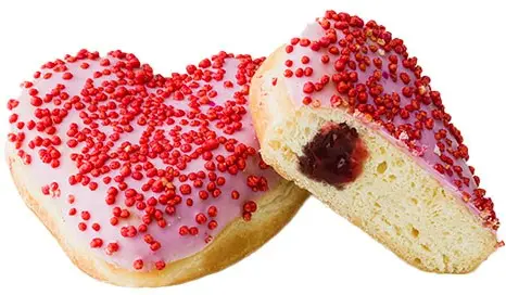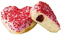 Hjärtformad Donut med fyllning av hallon toppad med glasyr och strössel.