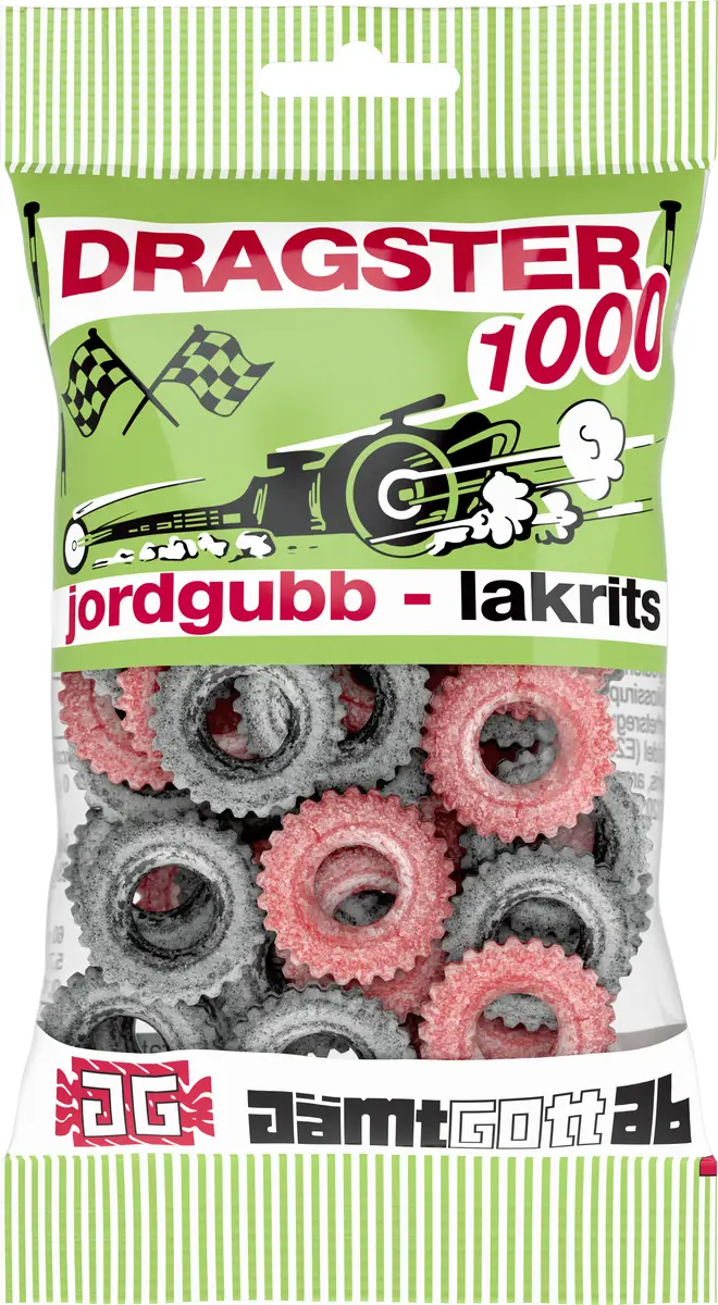 Dragster är ett klassisk gelegodis där de goda smakerna jordgubb/lakrits kompletterar varandra fint tillsammans med ett salt sockeröverdrag.