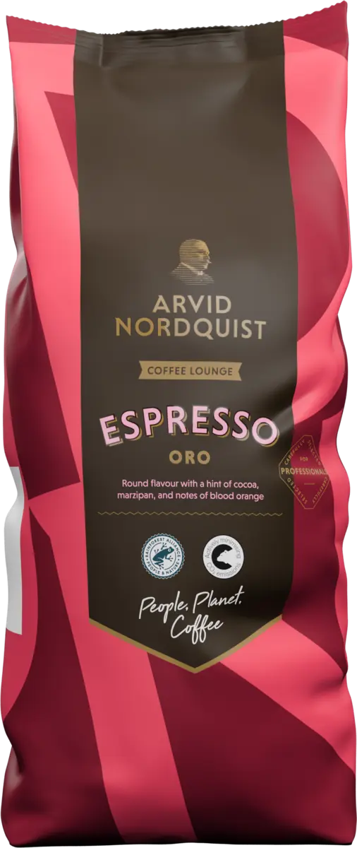 Arvid Nordquist Oro Generoso är vår mest intensiva espresso med inspiration från södra Italien. Den större delen otvättat kaffe från Brasilien, Colombia, Nicaragua och Etiopien ger en espresso med gyllenbrun crèma. 100% Arabicabönor. Kraftfull kaffesmak även med mjölkbaserade espressodrycker.