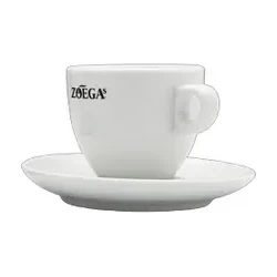 Stilren espressokopp med fat i porslin med Zoégas logga.