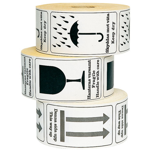Tillverkade av förstklassigt vitt, självhäftande papper, med permanent häftämne och med tryck i svart. Varje rulle innehåller 1000 etiketter.