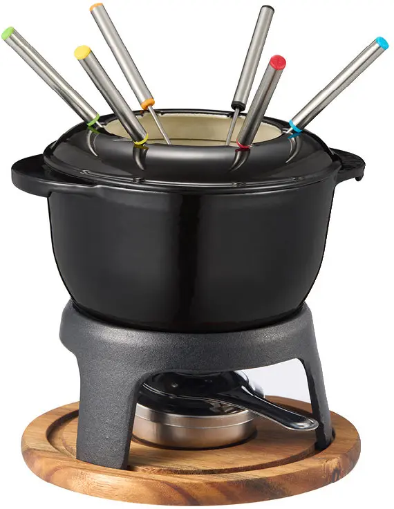 Foni Fondue gjutjärn emaljerad svart akacia träplatta Dorre