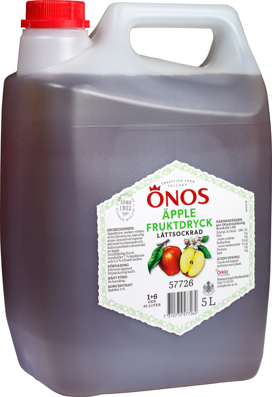 Äpple Lättsockrad Fruktdryck är fräsch och god med klassisk smak. Varsamt sockrad. Spädes 1+6 och ger 35 L färdig fryktdryck. Tillverkad i Sverige.
