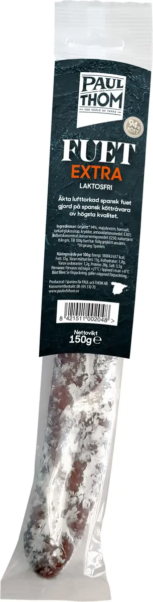 Fuet Extra är en Katalansk traditionell salami som är lufttorkad och laktosfri. God som tapas, i matlagningen, till pizza och på smörgås.