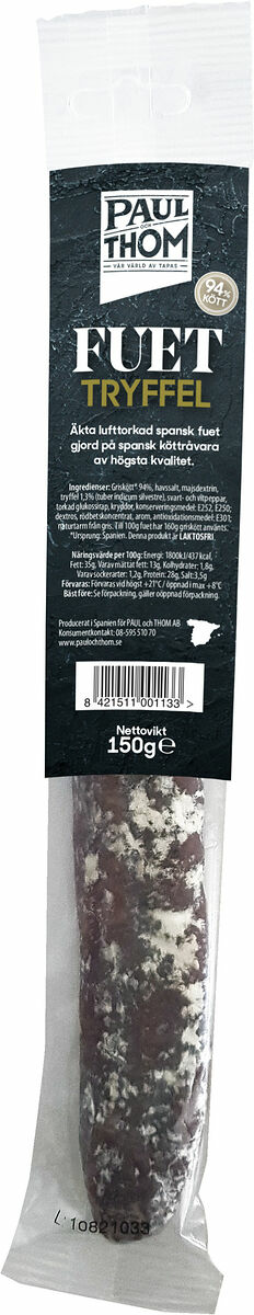 Fuet Extra är en Katalansk traditionell salami som är lufttorkad och laktosfri, här smaksatt med tryffel. God som tapas, i matlagningen, till pizza och på smörgås.