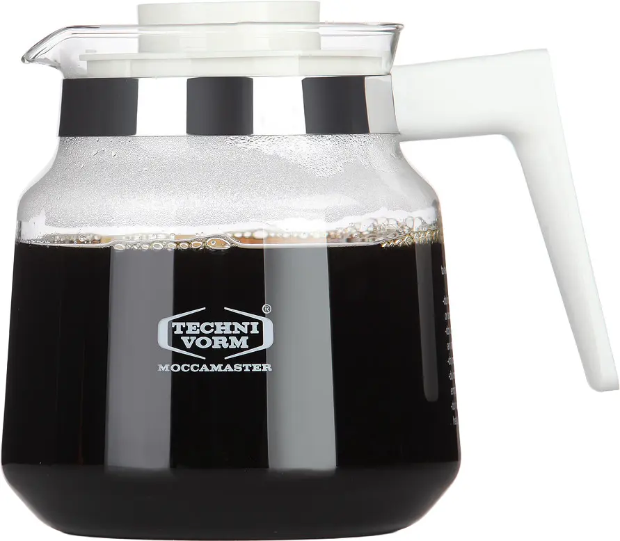 Denna originalglaskanna från Moccamaster levereras med vitt handtag.