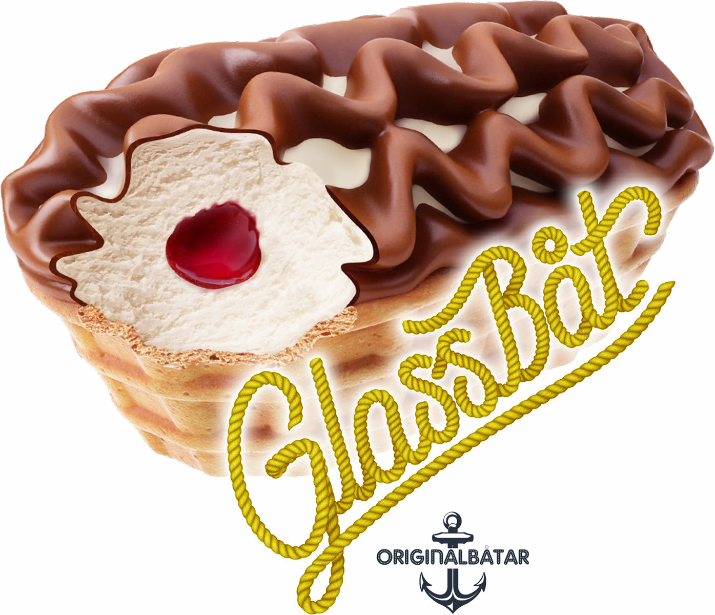 Gräddglass med vaniljsmak, jordgubbssylt och chokladöverdrag