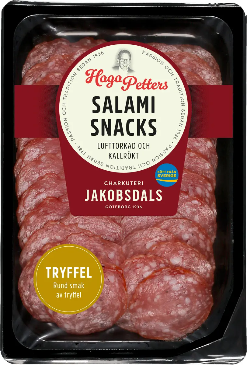 Kallrökt och lufttorkad Tryffelsalami av högsta kvalitet. Skivad i lite mindre och tunnare skivor. Enkelt att ta med och förvara då det ej behöver hanteras som kylvara.