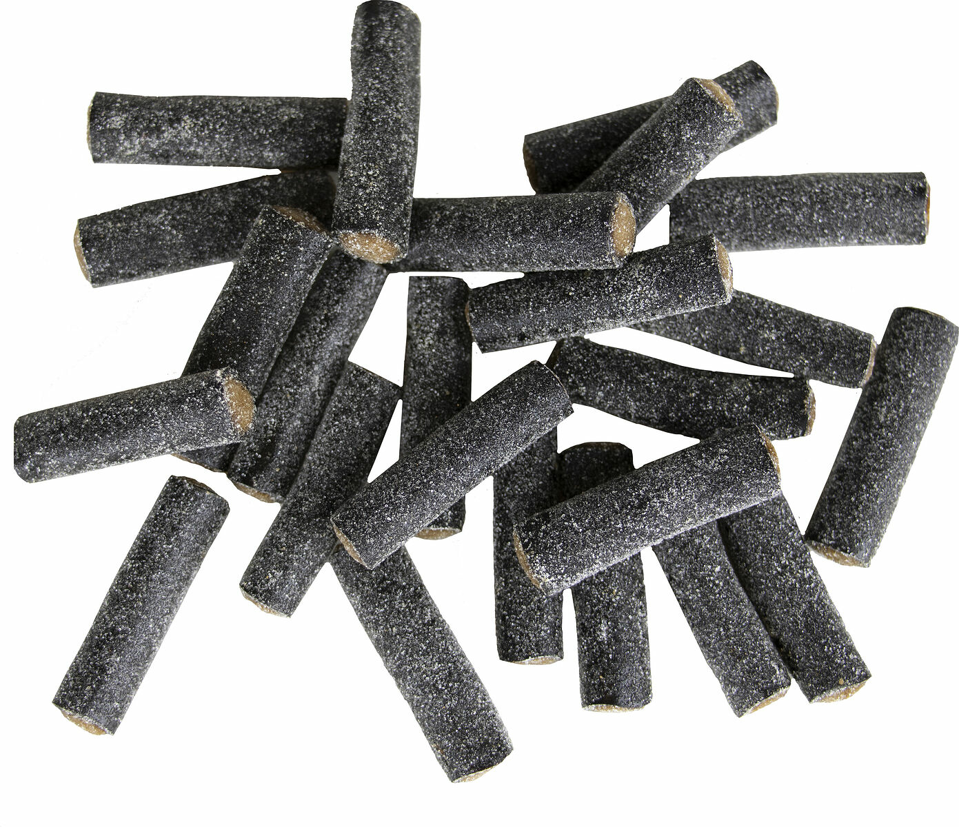 Sockerkanderad fylld lakrits med salmiak. Utan gelatin. Utan färgämnen.