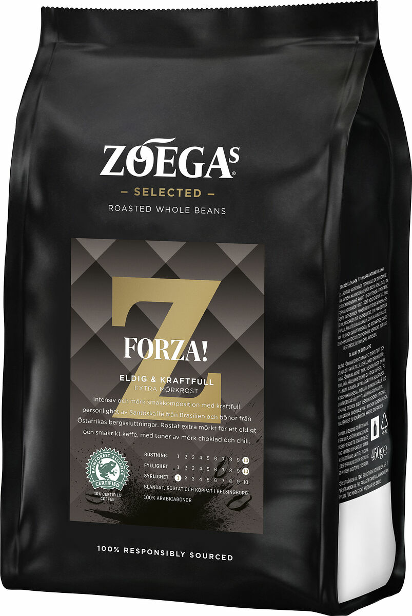 ZOÉGAS FORZA! - ELDIG & KRAFTFULL EXTRA MÖRKROST Intensiv och mörk smakkomposition med kraftfull personlighet där Santoskaffe från Brasilien samsas med högvuxna bönor från Östafrikas bergssluttningar. Rostat extra mörkt för ett eldigt och smakrikt kaffe, med toner av mörk choklad och chili. En av våra finaste kaffeblandningar gjord av 100% Arabicabönor, rostat och koppat i Helsingborg. FÖR ETT SMAKFULLARE LIV Zoégas grundades 1886 i Helsingborg av Carlos och Maria som båda hade en passion för ett fylligare och smakrikare mörkrostat kaffe. Idag lever deras kärlek för smak, kaffekunskap och hantverk kvar i allt vi gör på Zoégas. ZOÉGAS HÅLLBARHETSPROGRAM