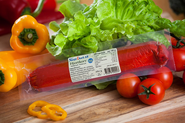 Hjortkorv 260 g. Påläggskorv med vitlök. Rökt på gammaldagsvis med enris och alspån.