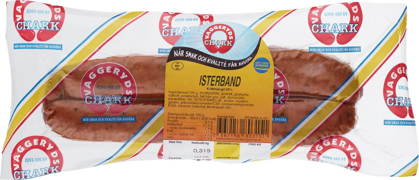 Vatten,Griskött, Korngryn, Grishjärta, Nötkött, Potatismjöl, Grisfett, Koksalt, Druvsocker, Potatisfiber, Lök,Vetestärkelse, Kryddor, Socker, Gelatin, Askorbat, (Antioxidationsmedel E301), Nitrit (Konserveringsmedel E250), Rökarom.