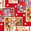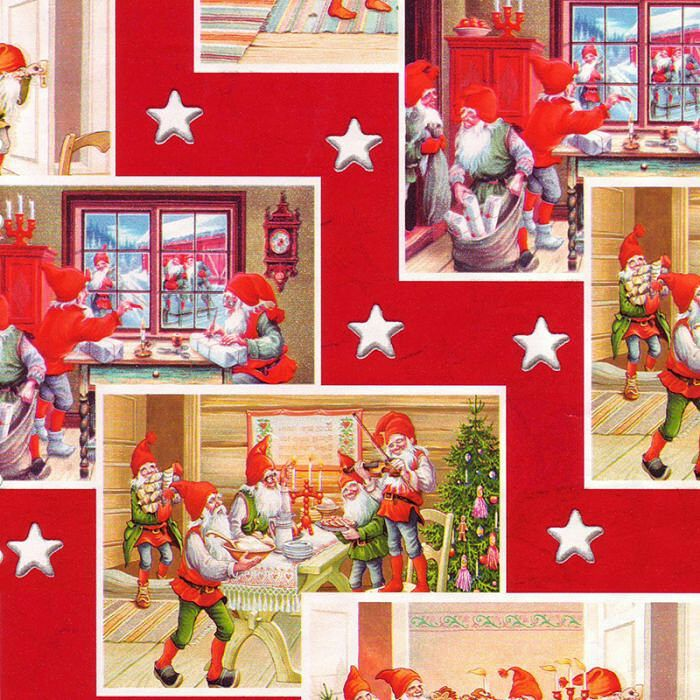 Röd botten med vackra julmotiv och små stjärnor i vitt.