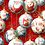 Röd botten med motiv av traditionella tomtar på vackra julkulor. Färgerna går i rött, blått, guld, grått och vitt.