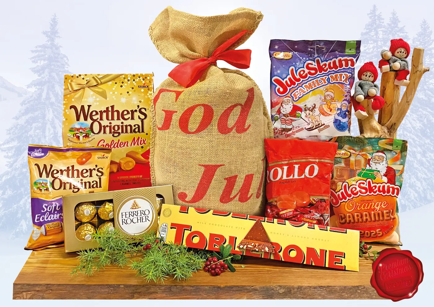 Sju godissorter i många varianter packas av tomteverksta’n i jutesäck God Jul 30x60 cm med rött band.