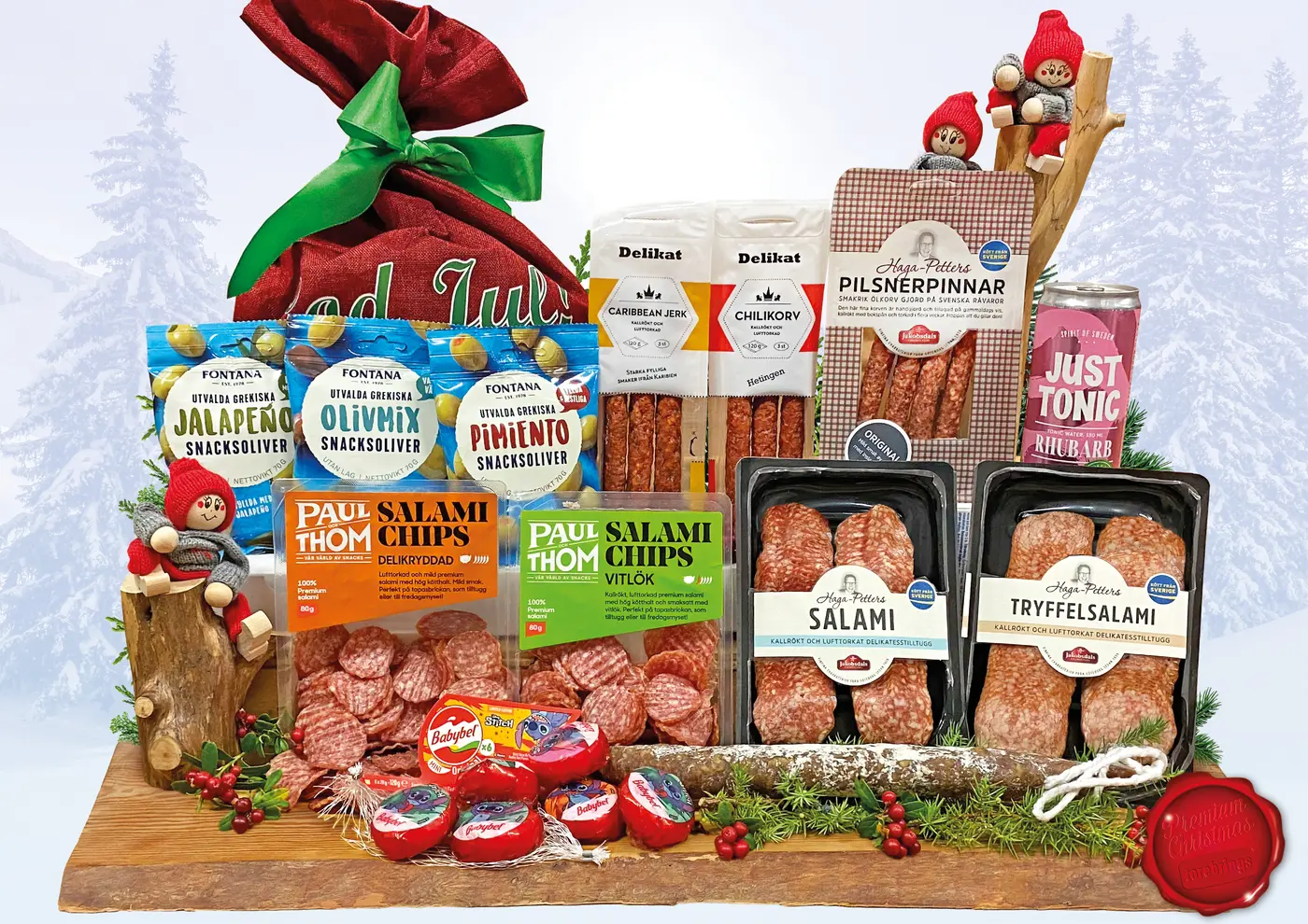 Dessa tretton varor packas omsorgsfullt av tomteverksta’n i Julsäck Röd Tomtedans 30x50 cm med grönt band. Nettovikt: 1410 g. Bruttovikt: 1800 g. Förvaras i rumstemperatur.