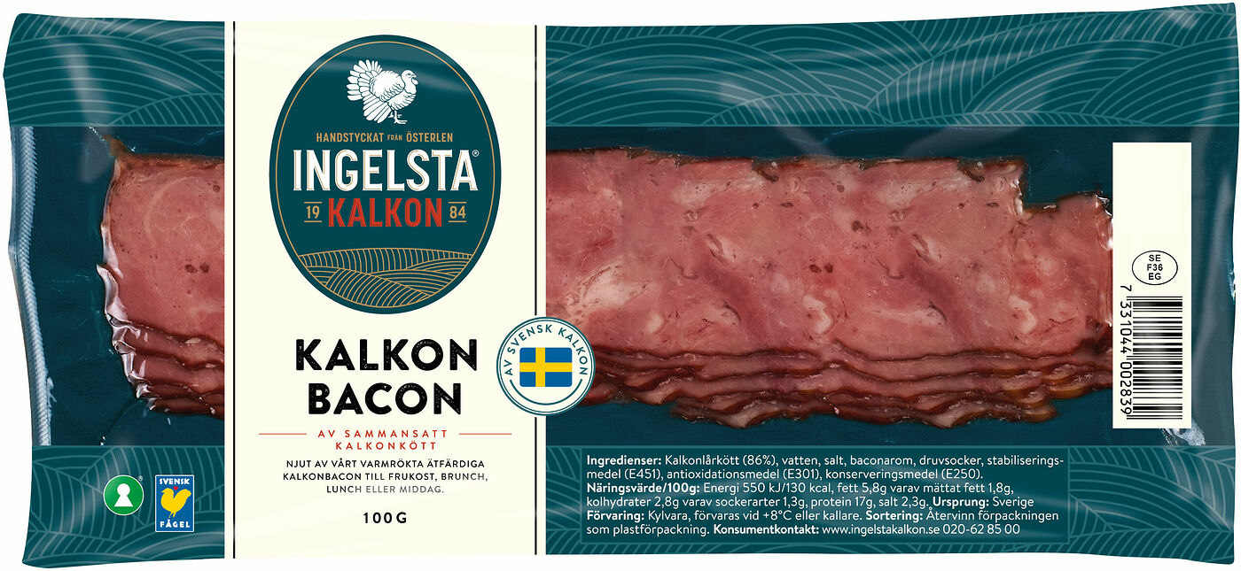 Ingredienser: Kalkonlårkött (86 %), vatten, salt, baconarom, druvsocker, stabiliseringsmedel (E451), antioxidationsmedel (E301), konserveringsmedel (E250).