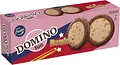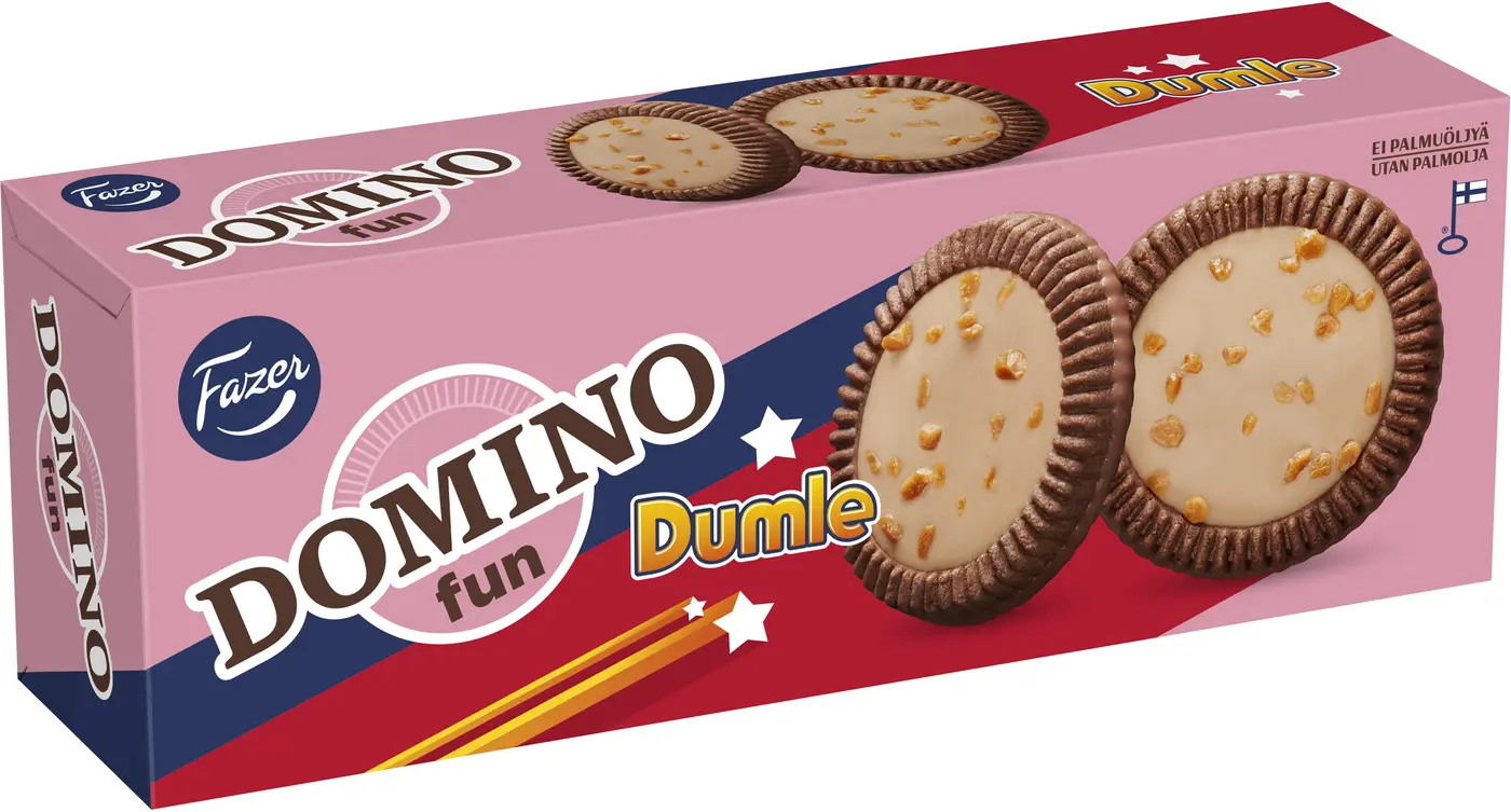 Domino Fun Dumle är en ny variant på Domino. Domino-kex med riklig och läcker fyllning med Dumle-smak, grova kolabitar ovanpå och med mjölkchokladöverdragen botten. Ingen palmolja.