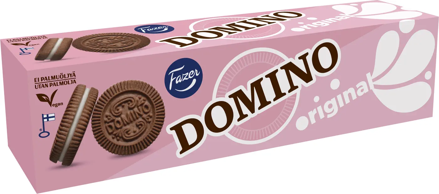 Domino är Finlands mest älskade kex som har funnits i finländarnas liv alltsedan 1953. De klassiska och ursprungliga fyllda Domino Original-kexen består av mörka kakaokex och en vit vaniljfyllning som bidrar med en god smakupplevelse. Förgyll din paus med ett Domino-kex eller två. Bjud även vännerna.