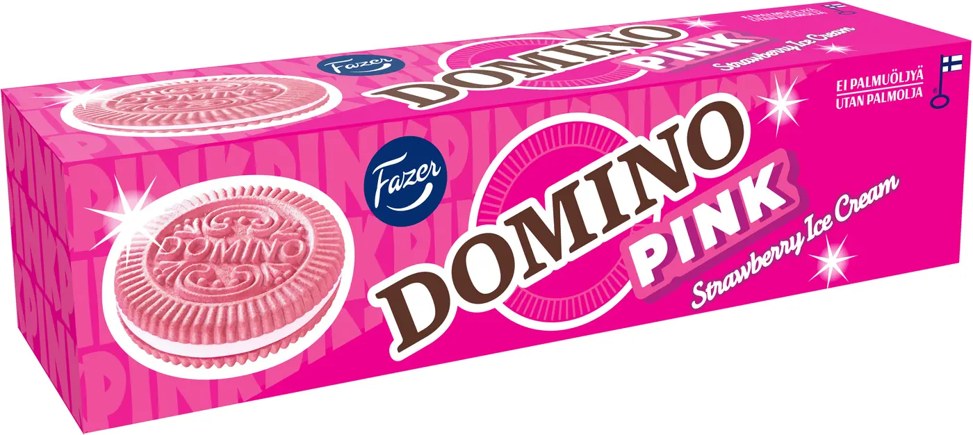I de fyllda Domino Pink -kexen möts läckra Domino-kex och en fyllning med jordgubbsmak. Domino Pink -kexen bakas utan palmolja och de passar även veganer. Servera läckra Domino Pink-kex på kaffebordet eller avnjut till vardag och fest.