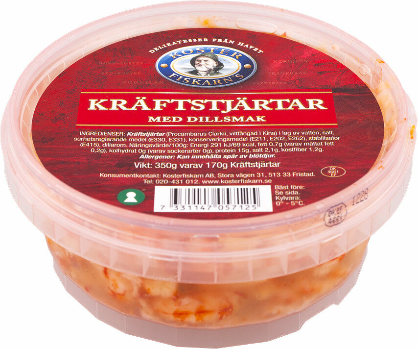 Kräftstjärtar (Procambarus clarkii) vatten, salt, surhetsreglerande medel E330, konserveringsmedel E211, E202, sötningsmedel E954, dillarom.