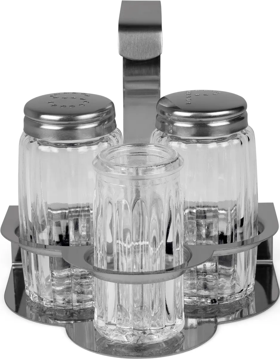 Komplett ställ i 4 delar rostfritt stål med störare och tandpetshållare i glas. Locken till ströarna har ett P för peppar och ett S för salt sansat i hålbilden. Ett slittåligt och stilrent ställ som passar utmärkt i många olika sorters miljöer. Framtagen för den professionella serveringen.