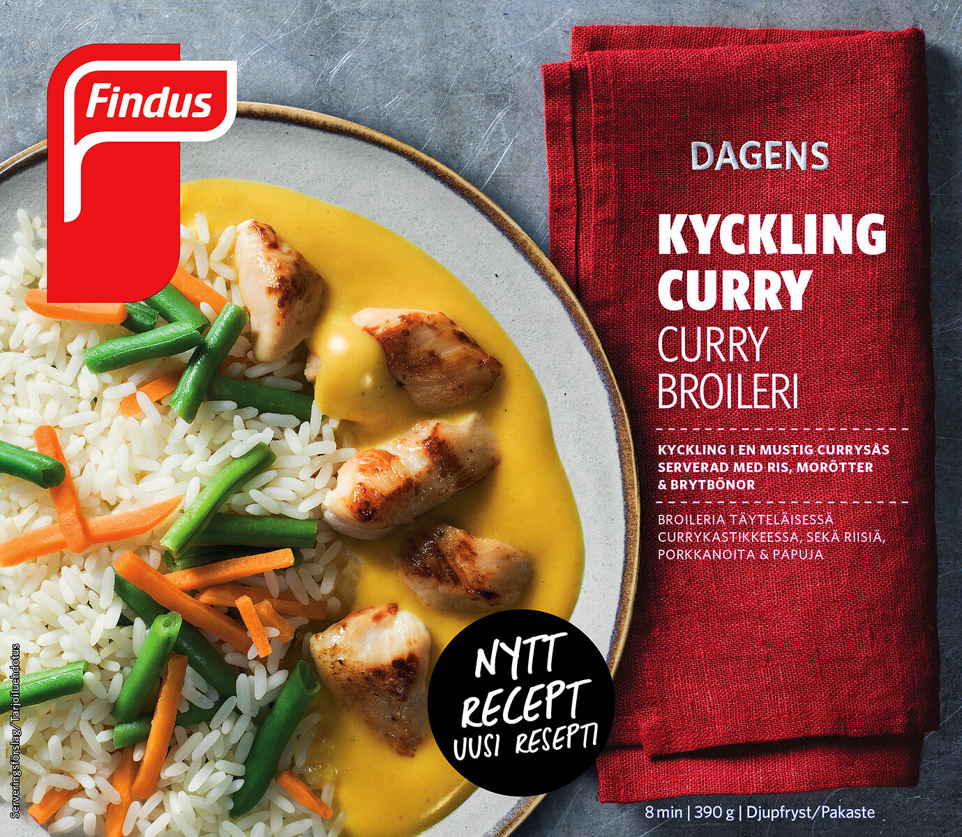 Kokt ris 31 %: Vatten, ris. Currysås 30 %: Skummjölk, äpple (4,6 %), grädde (mjölk), lök, rotselleri, morötter, majsstärkelse, rapsolja, salt, kryddor (gurkmeja, koriander, spiskummin, fänkål, bockhornsklöver, cayennepeppar, lagerblad, vit- och svartpeppar), timjanextrakt, solrosolja. Grönsaker 26 %: Morötter, gröna bönor. Stekt kyckling 12,5 %: Kyckling, tapiokastärkelse, druvsocker, salt. I rätten ingår 12 % kyckling. En portion ger dig 125 g grönsaker, rotfrukter och frukt.