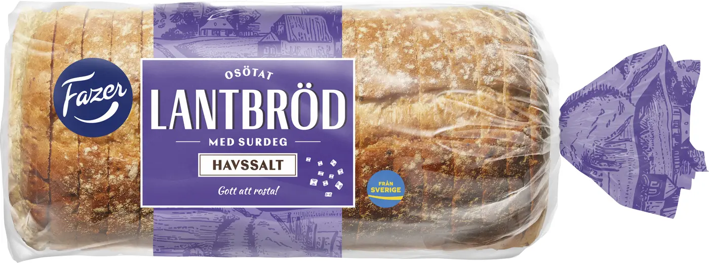 Fazer Lantbröd Havssalt – ett ljust osötat bröd bakat med surdeg och en nypa havssalt för att ge en extra dimension till smaken. Fazer Lantbröd Havssalt passar hela familjen och är ett gott till både frukost eller till en mustig soppa. Brödet är också gott att rosta, vilket ger det en krispig yta och en god mjuk kärna.
