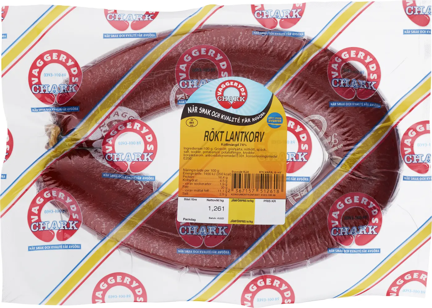 Griskött, Grishjärta, Nötkött, Späck, Koksalt, Socker, Potatismjöl, Potatisflingor, Kryddor, Konjaksarom, Askorbat, (Antioxidationsmedel E301), Nitrit (Konserveringsmedel E250)