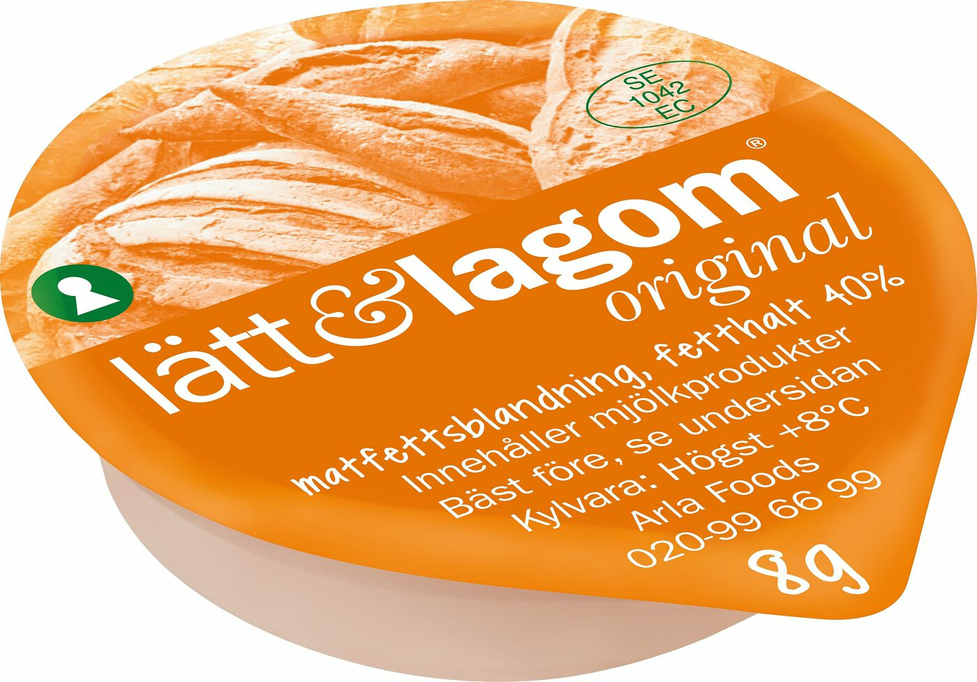 Lätt matfettsblandning i praktiska portionsförpackningar. Produkten är gjord i Sverige på svensk rapsolja, svensk kärnmjölk och shea- och kokosolja. Konsistensen är mjuk och produkten går lätt att använda, även när den är kylskåpkall. Lätt & Lagom kan njutas varje dag på såväl mjukt bröd som knäckebröd och kex.