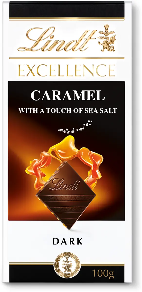 Lindt EXCELLENCE Caramel & Sea Salt är en chokladkaka av mörk choklad, tunn och intensiv med de finaste ingredienser skapad av Lindts Chokladmästare. Den perfekta blandningen av len mörk choklad med hög kakaohalt i kombination med söta krispiga bitar av karamell och spröda flingor av det handskördade havssaltet Fleur de sel - en sann smaksensation för alla sinnen. Hållbart odlade kakaobönor genom Lindt & Sprüngli Farming Program - i samarbete med jordbrukarna och deras lokalsamhällen.