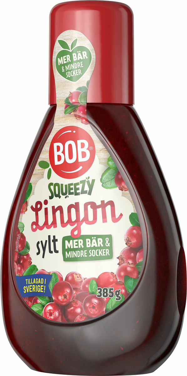 BOB Squeezy Lingon – Nu med 30% mindre socker. Sylten kokas i vår syltfabrik i skånska Tollarp. Hela bär krossas på plats i fabriken och kokas därefter till en slät konsistens som passar perfekt i klämflaskan. En praktisk förpackning och en smak som passar till hela familjen.