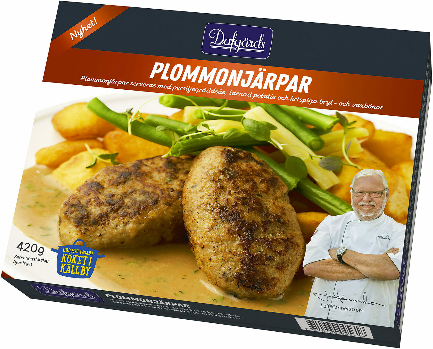 Plommonjärpar serveras med persiljegräddsås, tärnad potatis och krispiga bryt- och vaxbönor.
