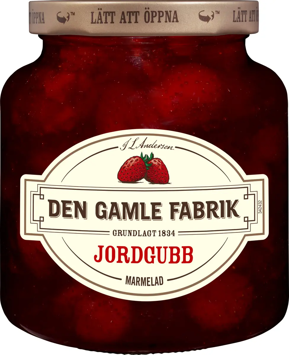Jordgubbsmarmeladen från Den Gamle Fabrik är med sina stora hela jordgubbar, känd för sin söta och friska smak. Den tillhör danskarnas absoluta favoritmarmelader och har vunnit åtskilliga smaktester under årens lopp.