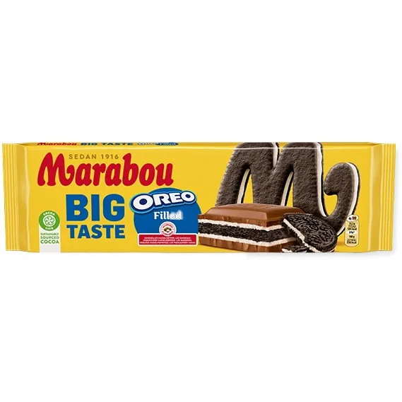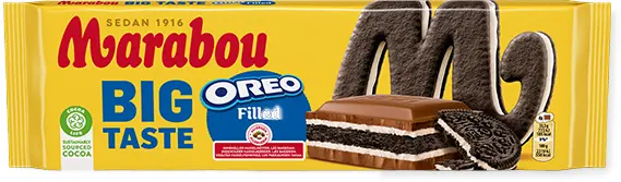 Marabou Big Taste Oreo är en mjölkchokladkaka med spröda OREO chokladkex med fyllning av vanilj som passar för alla tillfällen. Genom Cocoa Life, vårt program för en hållbar kakaoproduktion, bidrar Marabou till att kakao odlas på rätt sätt, för att skydda planeten och respektera mänskliga rättigheter i vår värdekedja. Läs mer om Cocoa Life här www.cocoalife.org.