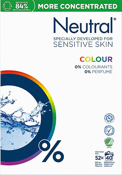 Neutral pulvertvättmedel Color är särskilt utvecklad för känslig hud, är parfymfritt och innehåller inga färgämnen för att minimera risken för allergi och överkänslighet. Tvättar effektivt rent från smuts och fläckar genom enzymer mot proteinfläckar av t.ex. blod, svett och urin. Innehåller inte blekmedel. Alla Neutrals tvättmedel är utvecklade tillsammans med Astma- och allergiförbundet. Miljömärkt med Svanen.
